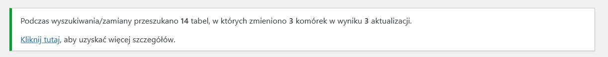 Uwaga! Zwróć uwagę na nazwę tabel. Domyślnie mają one prefix wp_ (np. wp_options, wp_posts), ale być może Twoja instalacja WordPressa korzysta z innego prefiksu. Wówczas oczywiście również należy go zmienić (po frazie UPDATE w każdym z 4 wierszy). Po wykonaniu powyższego polecenia wszystkie odnośniki w bazie danych ulegną zmianie.