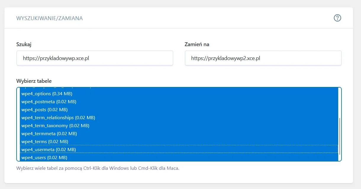 Zastąp stara-nazwa.com i nowa-nazwa.com swoją starą domeną i nową domeną w powyższym poleceniu. Spowoduje to znalezienie wszystkich wystąpień starej domeny w Twojej bazie danych i zastąpienie ich nową domeną.