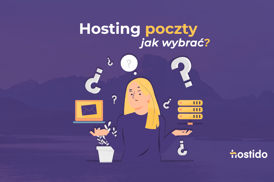 Grafika do artykułu „Hosting poczty – jak wybrać?”: kobieta z ikonami maila, serwerów i znaków zapytania na fioletowym tle.