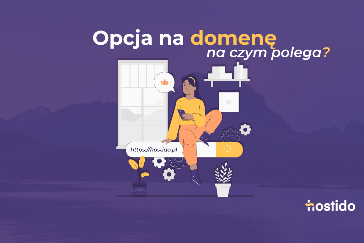 Ilustracja: opcja na domenę – na czym polega? z ikoną wyszukiwania i adresem hostido.pl